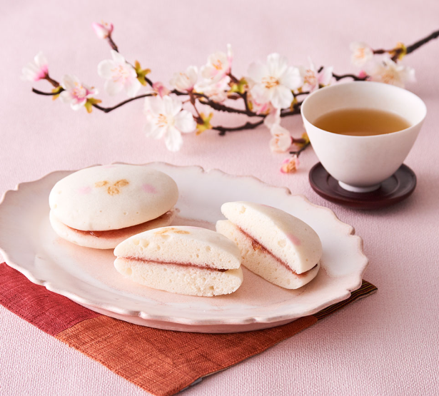 真っ白な蒸し生地に桜の花びらの焼き印を散らし、さくらんぼのジャム餡をサンドした春らしいお菓子【桜がさね】です🌸