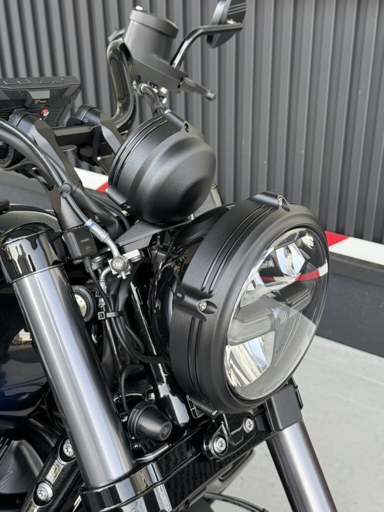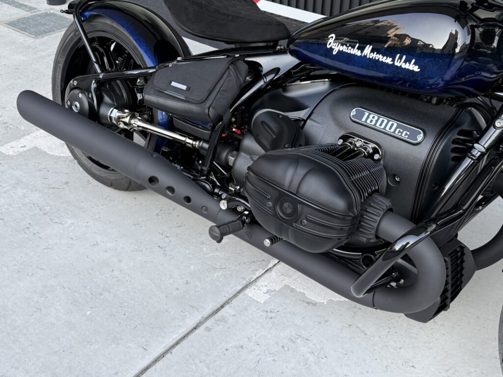 ブラックアウトされたフロントフォーク、エンジン、エキゾースト