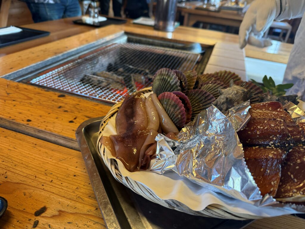 炭火で焼いてもらった新鮮な魚介類をいただきました😋